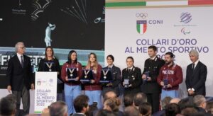 Nella palestra monumentale di Palazzo H, all’interno dell’Università degli Studi del Foro Italico di Roma, si è svolta oggi la cerimonia di consegna dei Collari d’Oro, la massima onorificenza dello sport italiano, che è stata riconosciuta agli atleti che quest’anno hanno conquistato un titolo mondiale o olimpico. Sul palco il presidente del CONI Giovanni Malagò, il presidente del Comitato Italiano Paralimpico Luca Pancalli e il ministro per lo Sport e i Giovani Andrea Abodi. Per le Marche a ricevere il Collare d’Oro, sono stati Alice Volpi e Tommaso Marini Vincitori nelle rispettive prove a squadre di fioretto ai Mondiali a Il Cairo. Premiati anche le Maestre Con Palma d’oro al merito Tecnico Giovanna Trillini e Maria Elena Proietti Mosca.