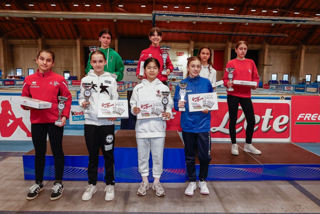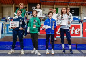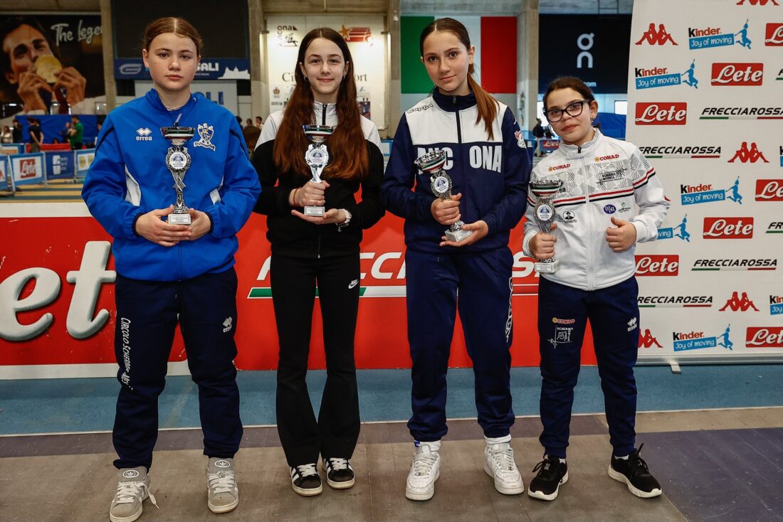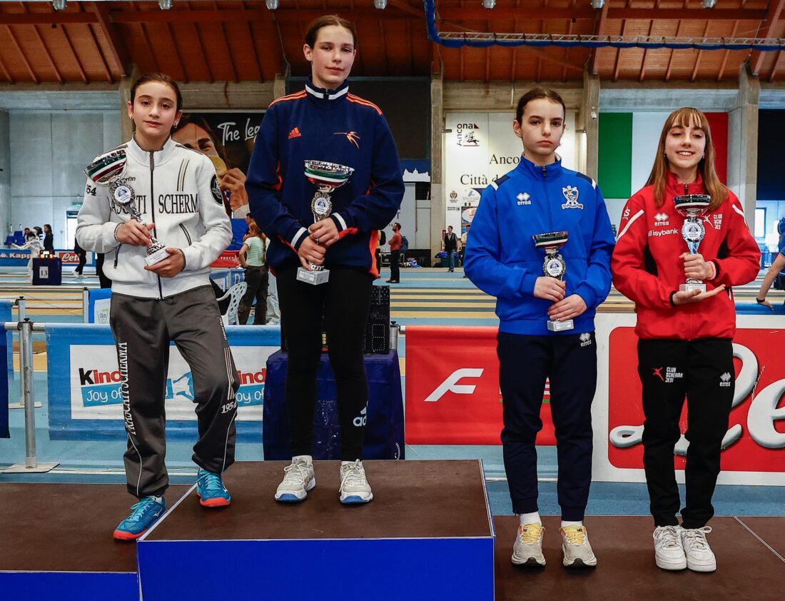 Magnifica vittoria anche di Maria Elena Li Bergolis e 5° posto di Emilia Caprari del Club Scherma Jesi, nelle Giovanissime. 37° Elisabetta Issini del Club Scherma Recanati; 40° Petra Carlone del Club Scherma Ancona; 56° Sara Smerilli dell’Accademia della Scherma Fermo; 60° Akemi Chiara Panniccià dell’Accademia della Scherma Fermo; 69° Killari Sophia Regina del Club Scherma Ancona; 71° Chiara Bracalente del Macerata Scherma; 75° Stefania Pierucci dell’Adriatica Scherma; 78° Elisa Giorgetti del Club Scherma Recanati;79° Alice Pieroni del Macerata Scherma;  82° Valeria Maviglia del Club Scherma Pesaro; 84° e 86° Anna Mattutini e Zara Mengoni del Club Scherma Recanati; xx° Petra Carlone del Club Scherma Ancona; xx° Stefania Pierucci dell’Adriatica Scherma; xx° Vittoria La Cecilia del Club Scherma La Misericordia Osimo; 94° Nina Torresi del Macerata Scherma; 92° Gaia Diomedi dell’Accademia della Scherma Fermo.
