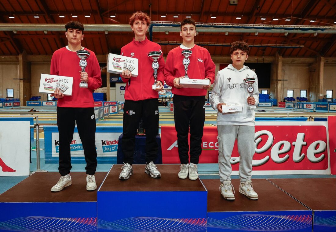 Nei Giovanissimi 10° Valerio La Porta del Macerata Scherma; 18° Riccardo Osti dell’Accademia della Scherma Fermo; 30° Joele Ricciotti del Club Scherma Fabriano; 33° Mattia Stipa del Club Scherma Ancona; 37° Mattia D’Ambrosio dell’Accademia della Scherma Fermo; 48° Simone Della Gatta del Club Scherma Ancona; 51° Pietro Gambi del Club Scherma La Misericordia Osimo; 57° Alberto Zari del Club Scherma Ancona; 61° Carlo Gabrielli del Club Scherma Jesi; 67° Niccolò Stroppa del Club Scherma Fabriano; 75° e 78° Giacomo Stampella e Daniele Pieragostini del Club Scherma Jesi; 83° Francesco Ferroni del Club Scherma Fabriano; 84° Niccolò Galeazzi del Club Scherma Ancona; 92° e 93° Nicholas Barocci e Gabriele Adam Cardinali del Club Scherma Jesi; 93° ex aequo Mattya Trucchia del Club Scherma La Misericordia Osimo; 95° Michele Vignoli del Club Scherma Fabriano.