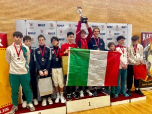 Oro nella gara a squadre under 14, dove la seconda rappresentativa italiana (ITA 2) ha conquistando uno splendido podio con Evan Felici, Neri Catarzi e Tiziano Sartogo, dopo una combattuta finale contro l’Ungheria risolta per 45-16. Il primo team azzurro (ITA 1), con Ludovico Monti, Almici Giorgio Agostino, Federico Marchitelli e Gabriel Penzo era stato, invece, fermato agli ottavi dall’altra squadra azzurra per 45-20.