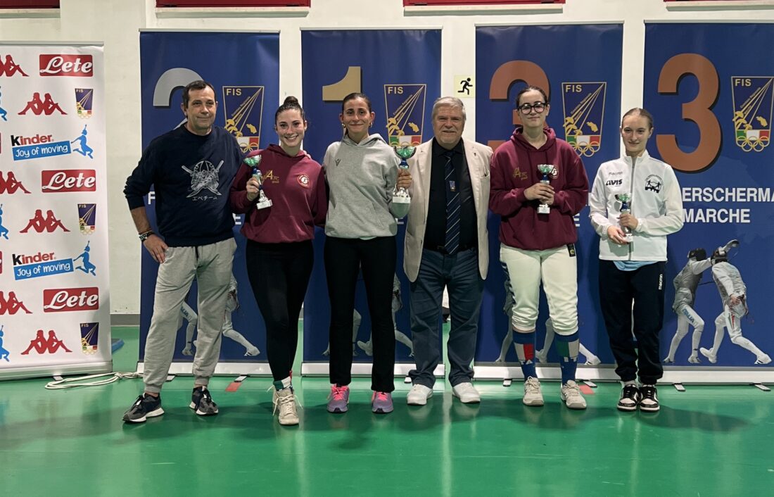 Nel pomeriggio appello in pedana alle 14,30 per la Spada femminile, dove le prime 4 hanno conquistato il pass per Roma, che ha visto la vittoria di Teresa Donatelli del Club Scherma Pesaro. 2° classificata Sara Tonelli del Fanum Fortunae Scherma; 3° ex aequo Asia Volpi del Fanum Fortunae Scherma e Letizia Lori del Club Scherma Fabriano; 5° Elisabetta Giovannetti dell’Accademia Scherma Fermo; 6° Vittoria Casciano del Fanum Fortunae Scherma; 7° Vittoria Lazzeri del Club Scherma Pesaro; 8° Eleonora Gregori del Club Scherma Fabriano; 9° Benedetta Pallotta del Club Scherma Fabriano 10° Vittoria Lucchino del Club Scherma Pesaro; 11° Thea Vignoli del Club Scherma Fabriano; 12° Ludovica Pensato del Club Scherma Recanati; 13° Francesca Di Dio del Club Scherma Jesi; 14° Victoria Gonzalez Pantanetti dell’Accademia Scherma Fermo; 15° Lucrezia Maria Cossu del Club Scherma Recanati; 16° Mireia Nomen Noguera del Club Scherma Jesi; 17° e 18° Ludovica Pettinari e Matilde Spadari del Macerata Scherma; 19° e 20° Matilde Sgamini e Giulia Levantesi dell’Accademia Scherma Fermo; 21° Greta Martusciello del Fanum Fortunae Scherma; 22° Alessandra Franco del Macerata Scherma; 23° Chiara Pintucci del Club Scherma Recanati.